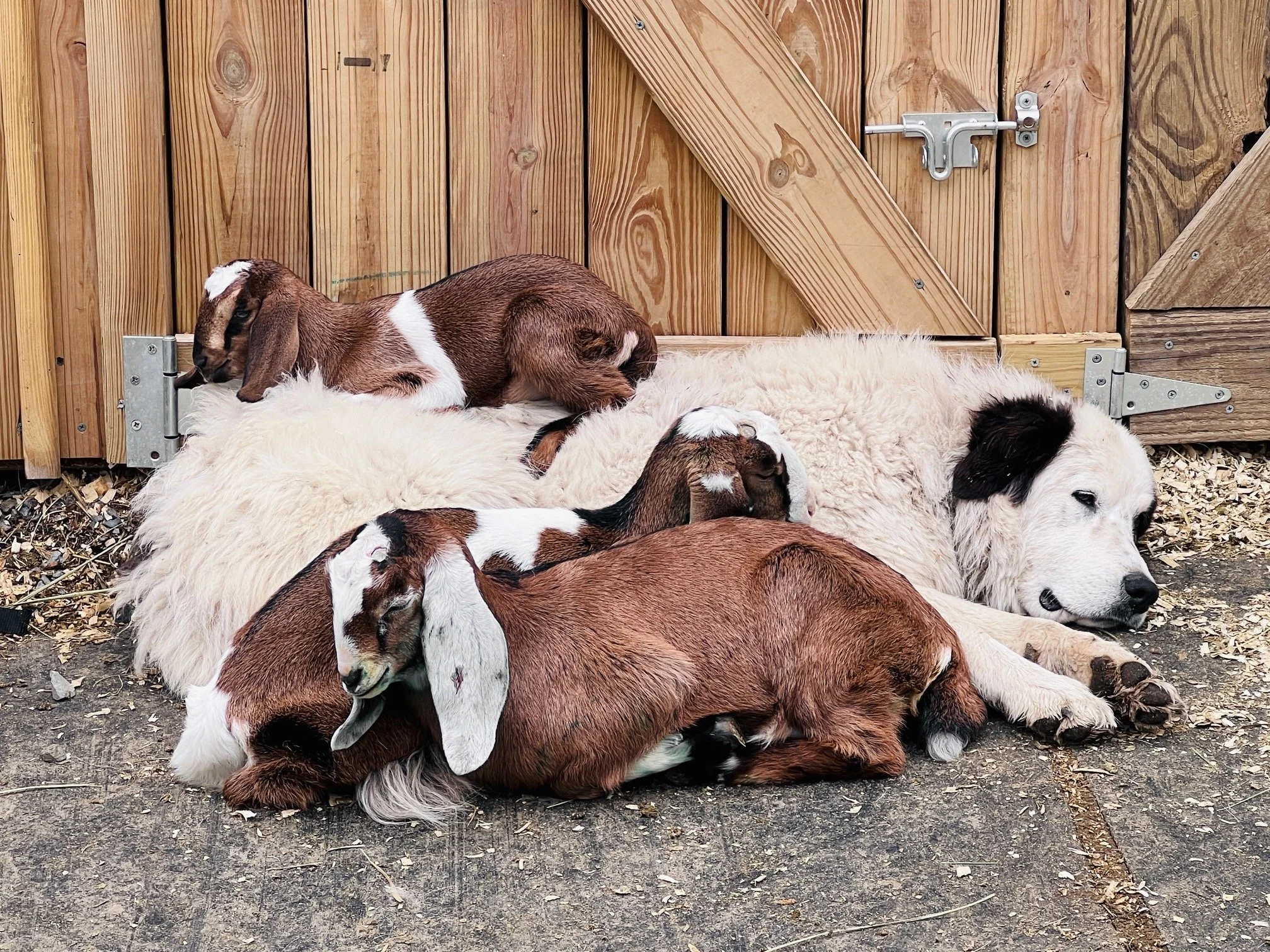 Alex with her spring babies, Andromeda (top), Star and Secret, snuggled in, safe and cozy.